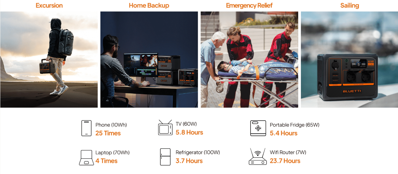 Sporting industry-leading Power Lifting technology*, AC60P can deliver max 1,200W from its 600W inverter to power high-wattage resistive appliances such as hair dryers and grils. With 7 versatile outlets, it can power a range of devices timely, like ice-makers, fridges, electric blankets, phones, laptops, and more. Just enjoy the outdoors with the comforts of home.