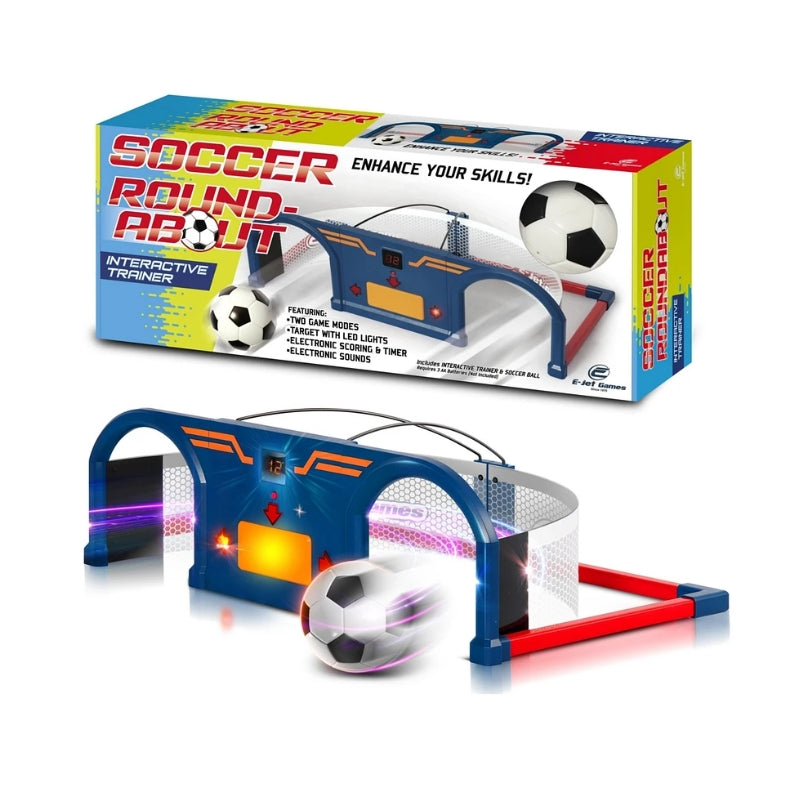 Future soccer stars can sharpen their skills anytime, anywhere with the E-Jet Games Soccer Roundabout. The soccer arcade has two game modes to help players improve their reflexes, first touch, ball control and foot-eye coordination, with electronic sounds to add some extra excitement. The target features easy-to-follow LED light indicators, while the electronic scoring and timer allow players to effortlessly track the progress of each game. Great for everything from entertaining kids on a rainy day at home to adding some friendly competition to a birthday party, the soccer training game is battery operated for portability.