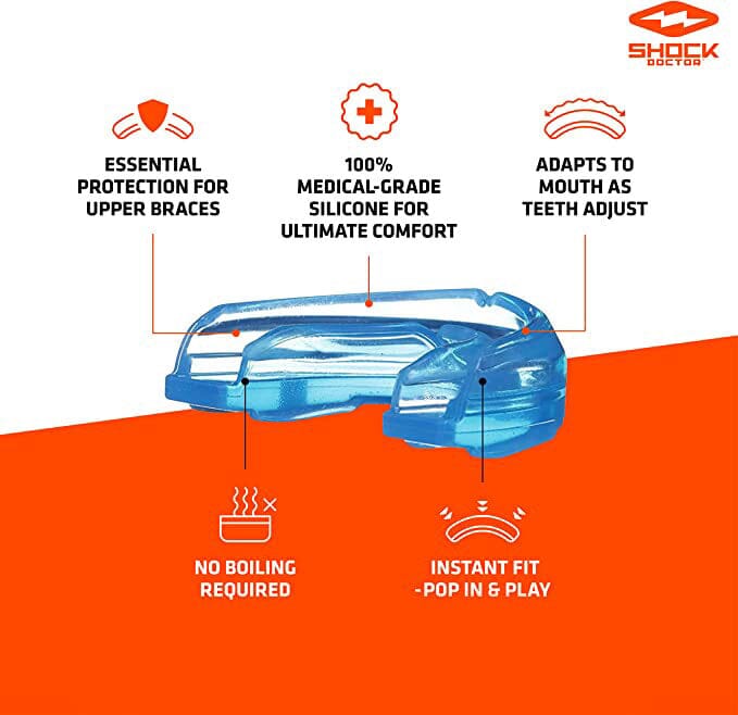 The Braces Mouthguard, offering essential protection for youth and adult athletes with braces, is specifically designed to conform to upper brace brackets for instant comfort and prevention from lacerations. Made with 100% medical-grade silicone, it adapts to changes in mouth structure as teeth adjust.