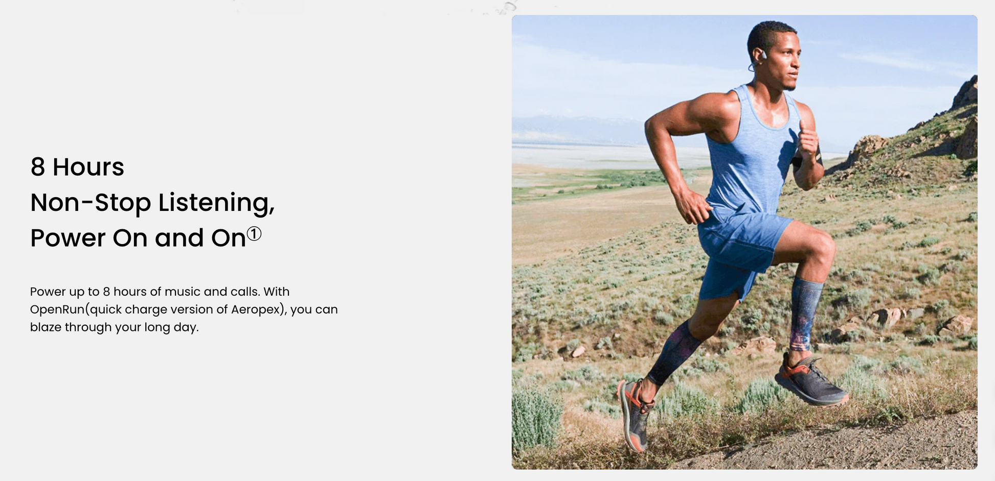 Be open to the world around you. Open-ear design allows you to hear music and traffic at the same time. Whether you are running on the streets or biking in the mountains, OpenRun( Quick Charge Version of Aeropex) brings a high-quality hearing experience without compromising on safety.