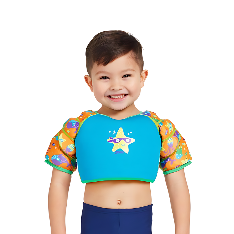 Watch your child learn to swim 5 times faster and grow in swim confidence with our fantastic Super Star Water Wings Vest! The Water Wings vest provides fixed buoyancy and encourages a natural swimming position to get little ones used to using their arms and legs to move around in the water. The Water Wing Vest features a neoprene body and super soft sleeves. The foam floats are strategically sewn into the arms and shoulders to provide exceptional buoyancy and ease of movement. The vest features a back zip with tab to hold it in place so little ones won't be able to remove the vest in the pool. The sleeves help to stop the jacket from riding up around the neck, so children can build their swim confidence in comfort with this fantastic vest. The Super Star Water Wings Vest is perfect for children Learning to Swim ( Stage 2 of Swim Development ) and is ideal for children to use in between learn to swim lessons. Available for ages 1 - 5 years or up to 25kg